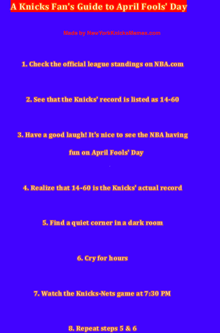A Knicks Fan’s Guide to April Fools’ Day Leave a reply Knicks fans, April 1 has arrived. New York Knicks Memes has put together an 8-step process to ensure you all can have a great April Fools’ Day! Rate this:LIKE & SHARETweet Click to share on Reddit (Opens in new window) Reddit Share on Tumblr Click to print (Opens in new window) Print Click to email a link to a friend (Opens in new window) Email PocketLike Loading... Related