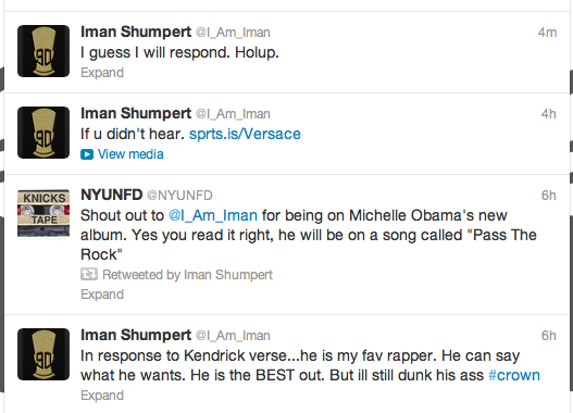 After rapper Kendrick Lamar got the internet buzzing after calling out every relevant rapper from his era Monday Night, another rapper has decided he is up for a challenge. That rapper happens to be Knicks guard Iman Shumpert, a promising young athlete who has dabbled in the rap game as his “side hustle”. Shumpert recently scored a gig on First Lady Michelle Obama’s upcoming rap album (yes, that is happening, but Michelle will not rap on the album herself), and is clearly feeling pretty confident. Shumpert dropped his latest freestyle yesterday, and just announced that “He Will Respond” to Lamar’s aggressive comments toward other young rappers.