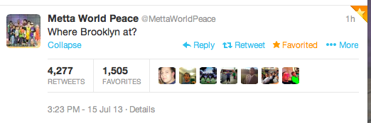 Metta World Peace Clearly Runs His Own Twitter Leave a reply And he doesn’t follow anybody, because Metta World Peace listens to no man. Rate this:LIKE & SHARETweet Click to share on Reddit (Opens in new window) Reddit Share on Tumblr Click to print (Opens in new window) Print Click to email a link to a friend (Opens in new window) Email PocketLike Loading...