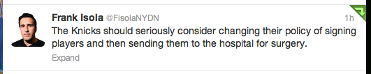 Knicks PF Jeremy Tyler was diagnosed with a stress fracture in his foot Thursday and will be out for 8-10 weeks, meaning he will miss all of training camp and at least the first week of the regular season. This is a minor blow for the team (which needs frontcourt depth) and a big blow for Tyler (who needs minutes). For Knicks fans, it is yet another frustrating injury. Eternal cynic Frank Isola put it best: